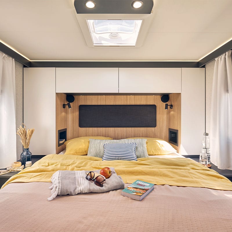 In den einladenden und bequemen Schlafbereichen unserer Fahrzeuge, können Sie erholsame Nächte auf einer serienmäßigen Qualitätsmatratze verbringen. Die Zimmer sind so konzipiert, dass Sie leichten Zugang zum Bett, großen Stauraum sowie einfachen Zugang zum Bad haben, ohne dabei Abstriche bei der Bettgröße machen zu müssen. Sie müssen sich nur Entscheiden: Einzel- oder Doppelbett?
